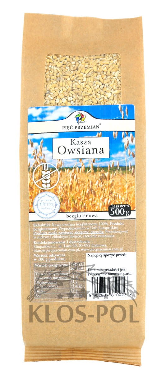 Kasza owsiana bezglutenowa PIĘĆ PRZEMIAN Składniki: Kasza owsiana bezglutenowa 100%. Produkt może zawierać alergeny: orzechy. Przechowywać w suchym i chłodnym miejscu, szczelnie zamknięte.